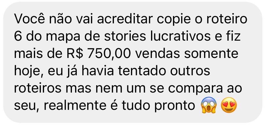 Copie & Cole +500 Sequências Lucrativas de Stories para Gerar directs com intenção de compra em menos de 24 horas, aplicando em apenas 05 minutos por dia, mesmo que você odeie aparecer, tenha poucos seguidores ou pouco tempo na sua rotina.