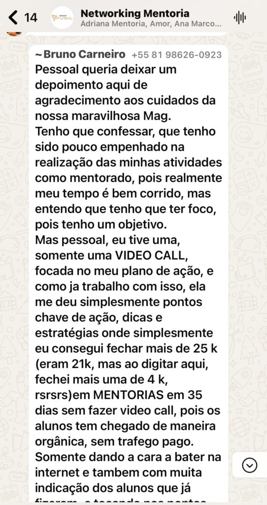 “Através do Grupo de Mentorados fechei vários negócios e parcerias, é o melhor Lugar para Network. Sem dúvidas.”